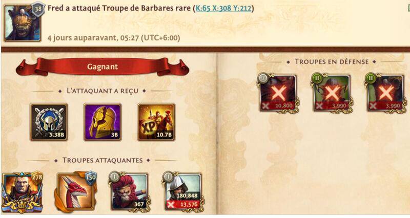 Les captures d’écran ci-dessous montrent un exemple concret : victoire contre une troupe de barbares rare, avec plus de 10,7 milliards d’XP gagnés en un seul combat.